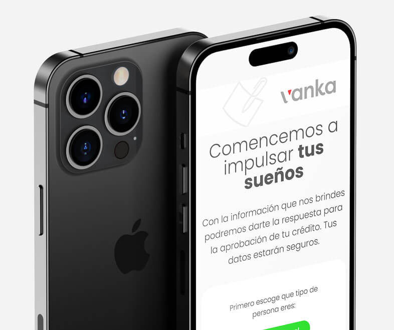 Nosotros, desde el ámbito digital, impulsamos a vanka a ser una Fintech en el país. Desde la generación de un sitio web hasta un sistema robusto de gestión de créditos. Estas imágenes muestran el formulario de solicitud de crédito desde los usuarios. Diseñamos una interfaz y experiencia de usuario cómoda, ágil y simplificada; facilitando su uso y haciendo de la solicitud de créditos un paso fácil en el proceso.